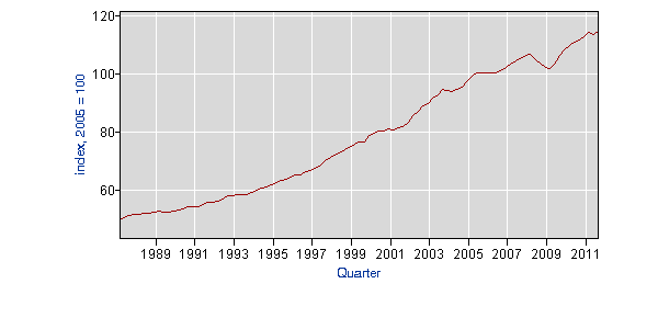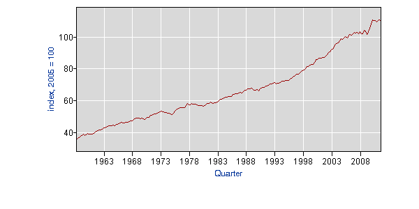 Year,Qtr1,Qtr2,Qtr3,Qtr4,Annual, 1958,35.624,36.165,36.826,37.615,36.562 1959,37.944,38.761,38.246,38.573,38.385 1960,39.231,38.819,38.997,39.103,39.037 1961,39.184,40.209,40.561,41.173,40.289 1962,41.685,41.736,42.160,42.728,42.079 1963,42.923,43.445,43.866,44.141,43.597 1964,43.978,44.192,44.622,44.377,44.296 1965,45.049,45.082,45.458,45.948,45.391 1966,46.211,46.127,46.135,46.335,46.202 1967,46.388,46.954,47.058,47.443,46.962 1968,48.052,48.587,48.887,49.078,48.655 1969,48.850,48.747,48.778,48.578,48.738 1970,48.270,48.896,49.630,49.535,49.078 1971,50.816,50.958,51.317,51.558,51.166 1972,51.725,51.974,52.289,52.867,52.222 1973,53.227,52.809,52.533,52.492,52.763 1974,51.915,52.007,51.539,51.345,51.704 1975,52.192,53.573,54.432,54.516,53.682 1976,55.309,55.393,55.659,55.594,55.490 1977,55.663,56.899,58.087,57.243,56.985 1978,57.443,58.120,57.648,57.741,57.742 1979,57.729,57.256,56.948,57.021,57.238 1980,57.000,56.482,57.041,57.737,57.065 1981,58.145,58.280,59.132,58.456,58.503 1982,58.387,58.625,58.701,59.011,58.679 1983,59.807,60.635,61.007,61.087,60.642 1984,61.580,61.937,62.195,62.396,62.030 1985,62.492,62.683,63.851,63.993,63.255 1986,64.252,64.373,64.625,65.175,64.608 1987,64.904,65.642,66.314,66.648,65.885 1988,67.321,67.529,67.448,67.909,67.555 1989,66.861,66.317,66.569,66.749,66.624 1990,66.245,67.366,67.625,68.196,67.355 1991,68.391,69.047,69.218,69.476,69.031 1992,70.447,70.555,70.845,71.241,70.774 1993,70.366,70.850,70.919,71.554,70.926 1994,72.365,72.358,72.222,72.572,72.382 1995,72.437,72.656,73.350,74.004,73.115 1996,74.830,75.432,76.256,76.653,75.798 1997,76.619,77.263,78.343,78.890,77.784 1998,79.082,80.143,81.369,81.221,80.459 1999,82.434,82.796,82.820,84.055,83.029 2000,85.890,85.986,86.775,86.722,86.408 2001,86.633,86.980,87.073,87.875,87.134 2002,89.043,90.192,90.813,91.862,90.474 2003,92.559,94.001,95.224,95.954,94.432 2004,96.340,97.668,98.915,98.454,97.848 2005,99.373,100.254,99.390,100.975,100.000 2006,101.631,101.042,102.200,102.701,101.893 2007,102.634,102.874,102.024,103.262,102.698 2008,101.879,102.157,104.302,103.696,102.993 2009,101.540,103.328,105.640,108.321,104.672 2010,110.747,110.404,110.389,109.511,110.258 2011,110.128,110.987(R),110.255, , R : revised